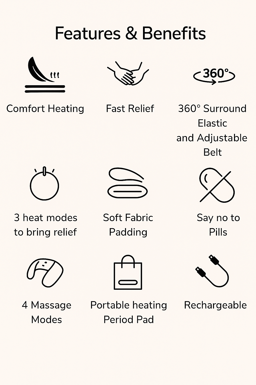 Our Period Cramp Relieving Heating Pad and Massager uses USB charging, ensuring convenience and flexibility. With three adjustable temperature settings and four massage modes, you can customise your experience based on your unique needs. It seamlessly fits into your lifestyle, allowing you to manage your period discomfort without disrupting your daily activities.